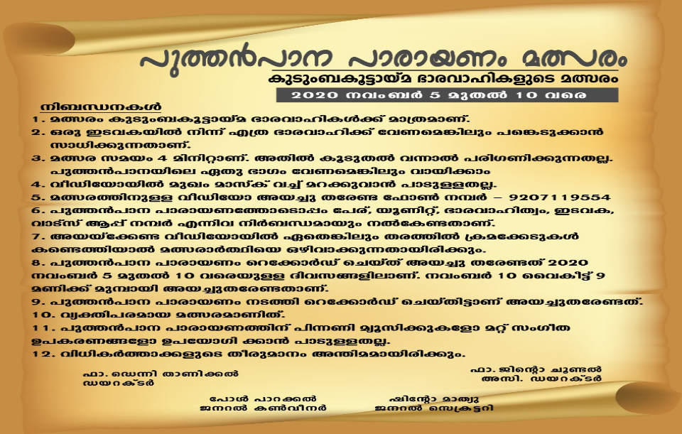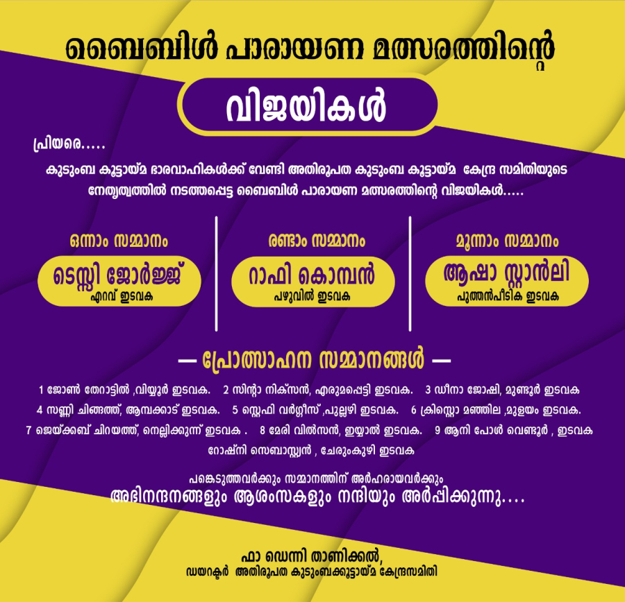 The Family Apostolate of the Thrissur Archdiocese is a dedicated initiative aimed at strengthening family values and promoting spiritual growth within the Catholic community. Through various programs and activities, the Apostolate seeks to foster a deeper understanding of the Christian family model, emphasizing love, faith, and mutual support among family members. It provides resources for couples and families to navigate the challenges of modern life, encouraging them to grow together in their faith and live out their values in everyday situations. The Apostolate organizes workshops, retreats, and family gatherings that serve to educate and inspire families, ensuring they remain grounded in their faith amidst societal changes.